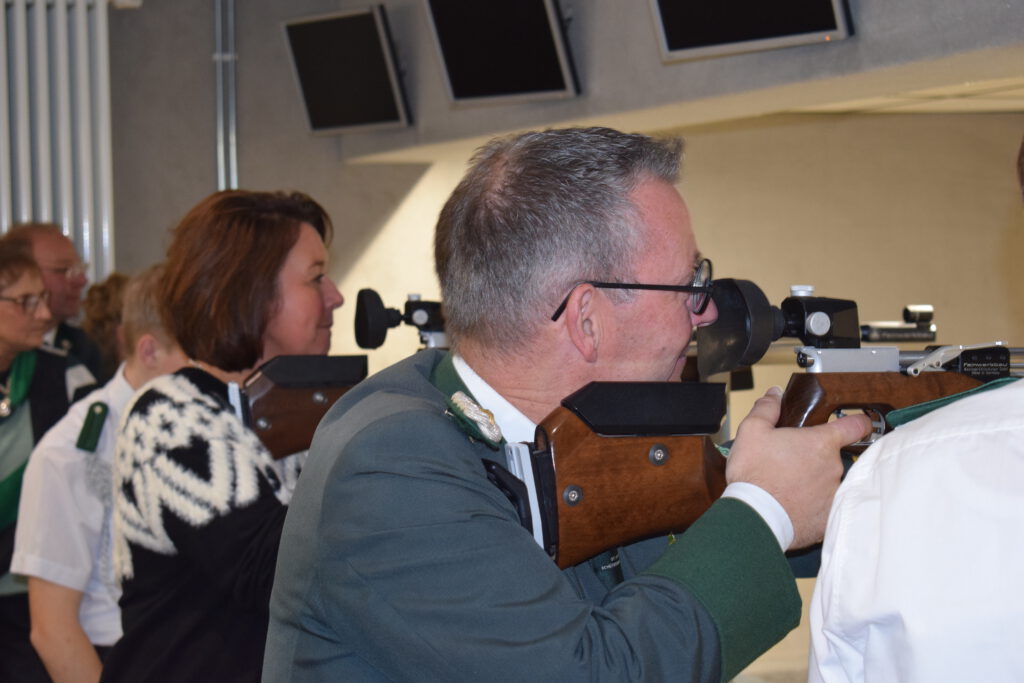 Der Nachmittag begann mit einem gemeinsamen Kaffeetrinken, das vom amtierenden Königspaar Thomas und Corinna Hansmeier mit ihrem Thron organisiert wurde. Dabei wurden Schützenfestfilme aus den vergangenen Jahrzehnten gezeigt. Beim anschließenden Schießen kümmerte sich Schießmeister Markus Himmeldirk um einen reibungslosen Ablauf. Zunächst galt es bei dem von den beiden Jungschützenmeistern Dominic Hermes und Tobias Erlei gebauten Vogel die Insignien zu treffen. Die Krone sicherte sich Elisabeth Hollenbeck, die an der Seite ihres Mannes Bernhard im Jahr 1997 die Bruderschaft regierte. Den Apfel bezwang Robert Brüggershemke, König im Jahr 2014. Achim Kolkmann, Regent im Jahr 2017, schoss das Zepter.